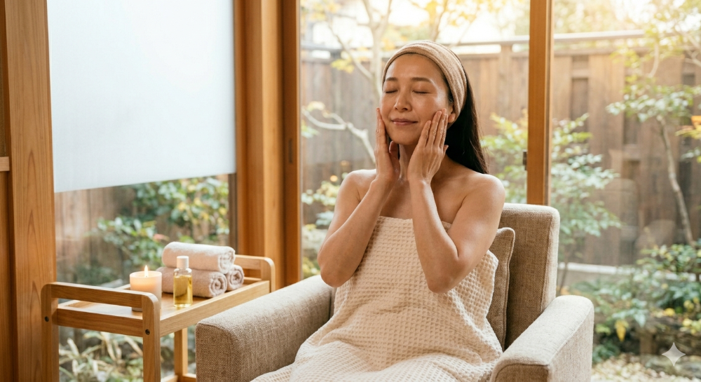 頬骨のあたりを手のひらで包み込み、斜め上(こめかみ方向)に優しくホールドする習慣をつけましょう。