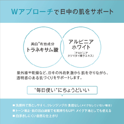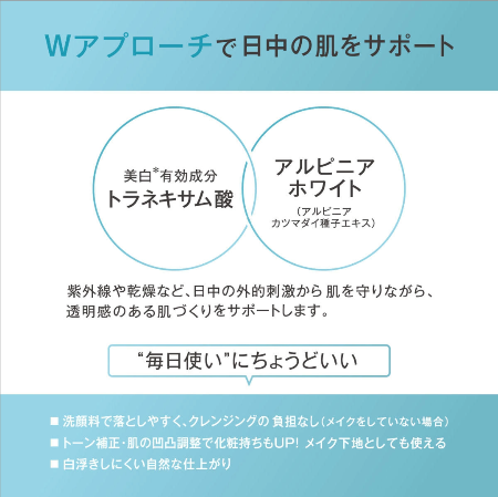 日中の紫外線ダメージとシミ・肝斑悩みに多角的にアプローチしながら、スキンケア級の保湿成分で肌をなめらかに整え、化粧ノリもUP。